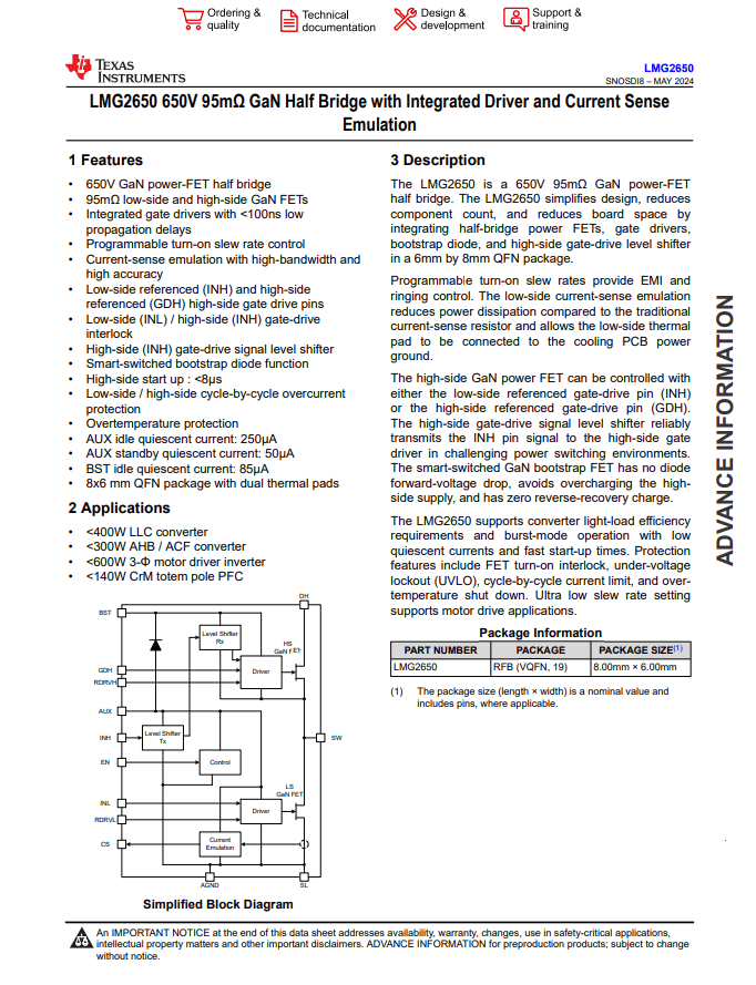 LMG2650 是一款 650V、95mΩ 氮化镓(GaN)功率 FET 半桥器件。它通过在 6mm × 8mm QFN 封装内集成半桥功率 FET、栅极驱动器、自举二极管和高侧栅极驱动电平移位器,简化了设计,减少了元件数量,并节省了电路板空间。