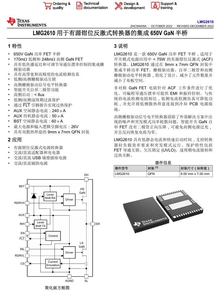 智能开关 GaN 自举 FET 没有二极管正向压降,可避免高侧电源过充,并且反向恢复电荷为零。LMG2656 具有低静态电流和快速启动时间,可满足转换器轻负载效率要求,并实现突发模式运行。保护特性包括 FET 导通互锁、欠压锁定 (UVLO)、逐周期电流限制和过热关断。超低压摆率设置支持电机驱动应用。