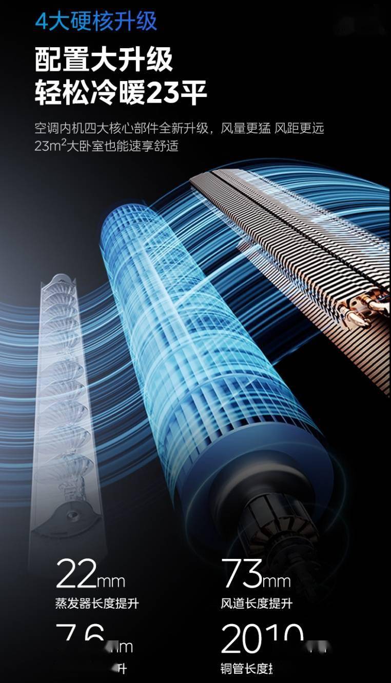 美的空界 M5 空调内机四大核心件升级:蒸发器长度提升 22mm、风道长度提升 73mm、风轮直径提升 7.6mm、铜管长度提升 2010mm,拥有 1 级能效等级,并提供一键酷省电功能,号称“立省 25% 电量”。