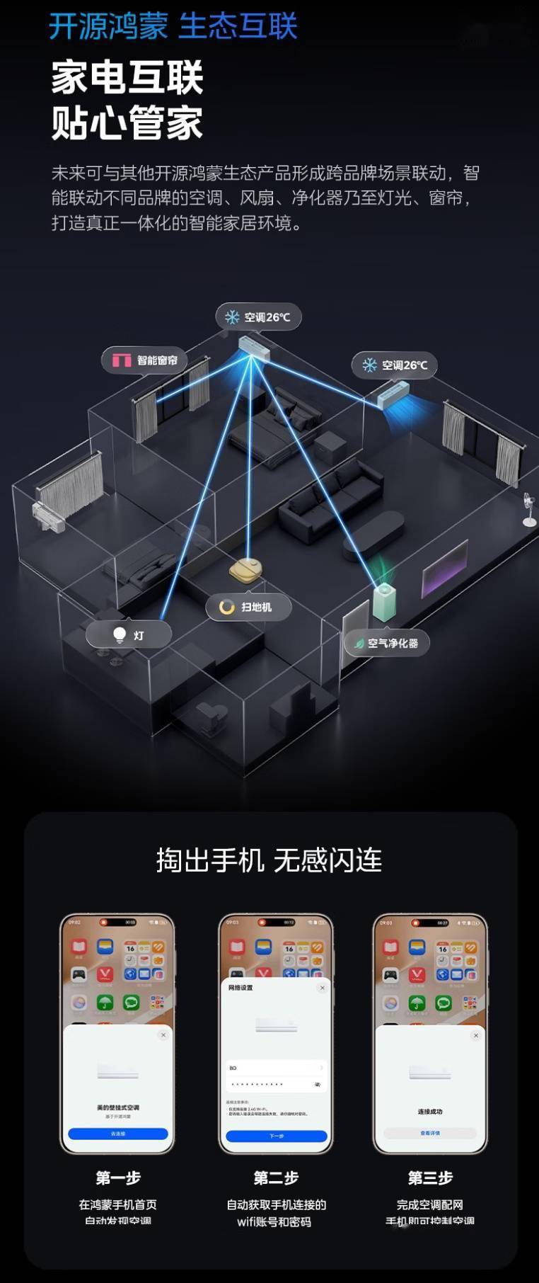 美的空界 M5 空调还支持开源鸿蒙生态互联,接入人车家生态,支持车机语音、中控屏联动等;搭载海思 AI 变频芯片,支持 AI 智慧控风,宣称算力提升 700%,支持 3 毫秒快响应。