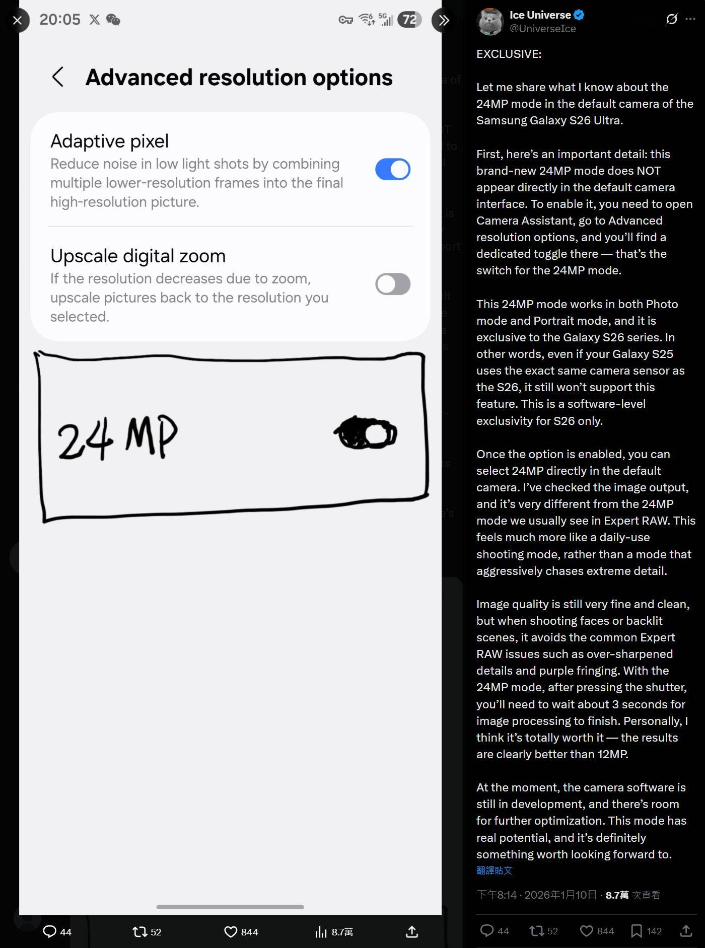 IT之家 1 月 11 日消息,消息人士 UniverseIce 昨天在 X 平台透露,三星 Galaxy S26 系列手机将首次提供 2400 万像素模式开关。