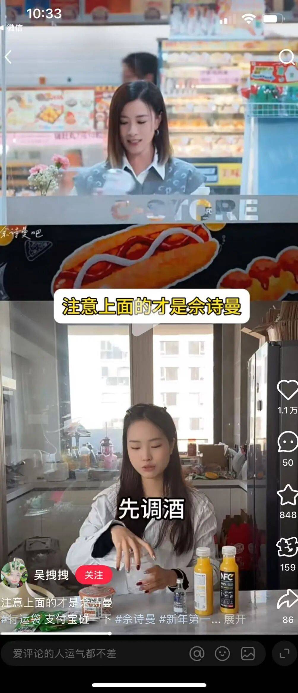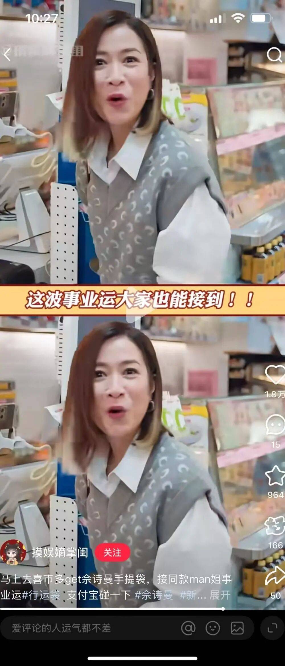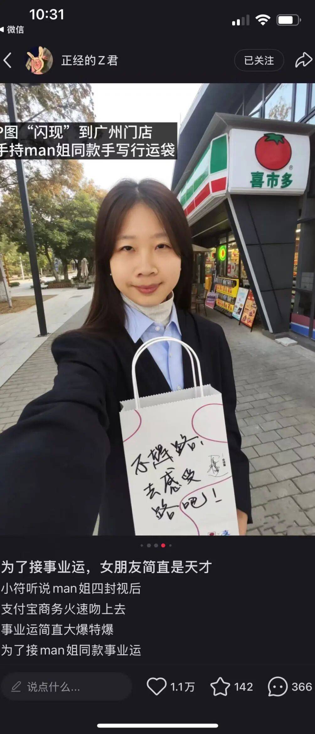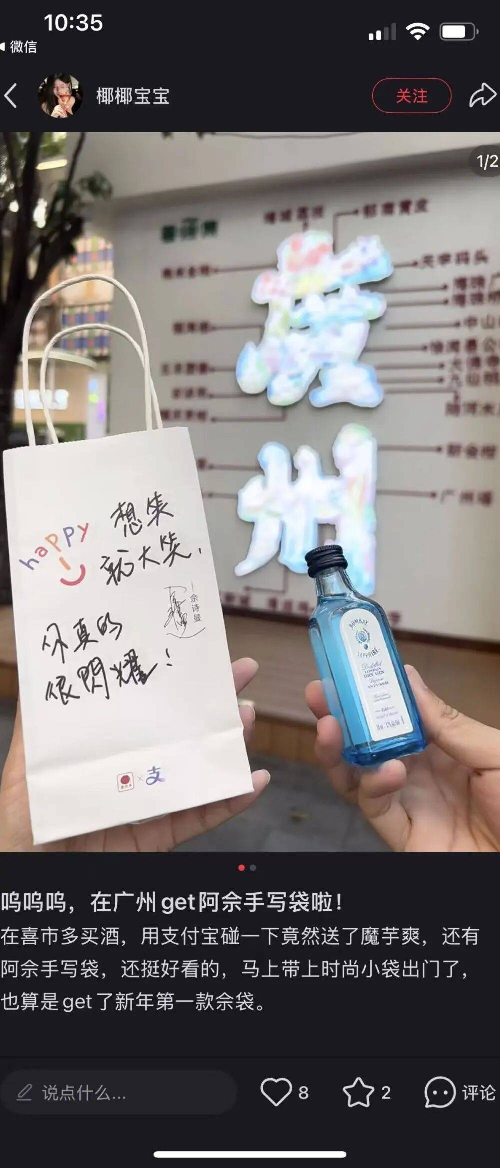 广州三家喜市多门店更是成为线下“打包视后同款事业运”的打卡点——有用便利店食材复刻 “Man 姐同款微醺配方”的,也有举着印有佘诗曼手写金句的 “行运袋” 拍照打卡的。这波操作的源头,竟是佘诗曼隔空互动便利店调酒火了后,网友在支付宝评论区的集体许愿:“想看佘诗曼玩便利店调酒!”“想要 Man 姐同款好运 Buff!”没想到支付宝真・有求必应,直接把网友的“脑洞”变成现实:每周五用支付宝“碰一下”买酒,不仅送魔芋爽当“酒搭子”,还限量解锁佘诗曼联名“行运袋”(购物纸袋)。