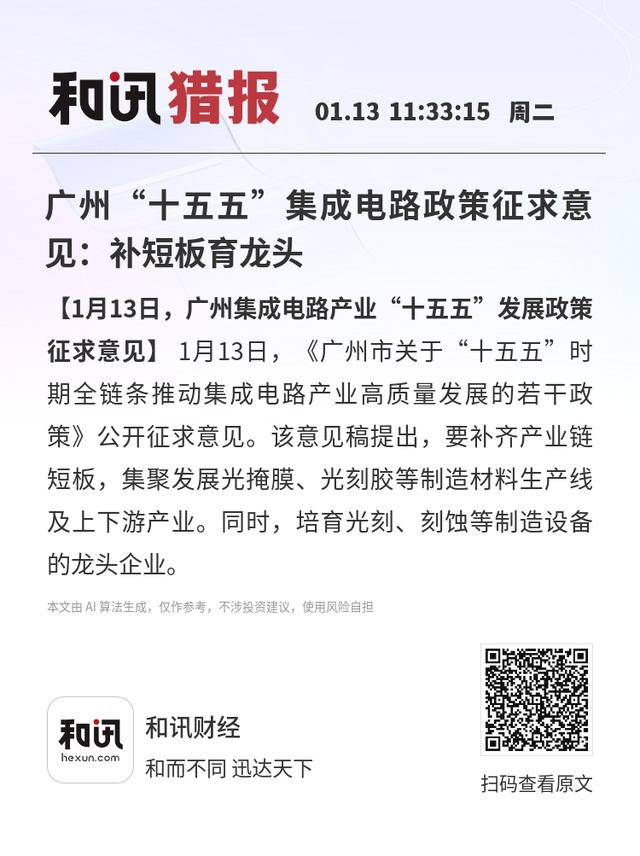 【1月13日,广州集成电路产业“十五五”发展政策征求意见】1月13日,《广州市关于“十五五”时期全链条推动集成电路产业高质量发展的若干政策》公开征求意见。该意见稿提出,要补齐产业链短板,集聚发展光掩膜、光刻胶等制造材料生产线及上下游产业。同时,培育光刻、刻蚀等制造设备的龙头企业。