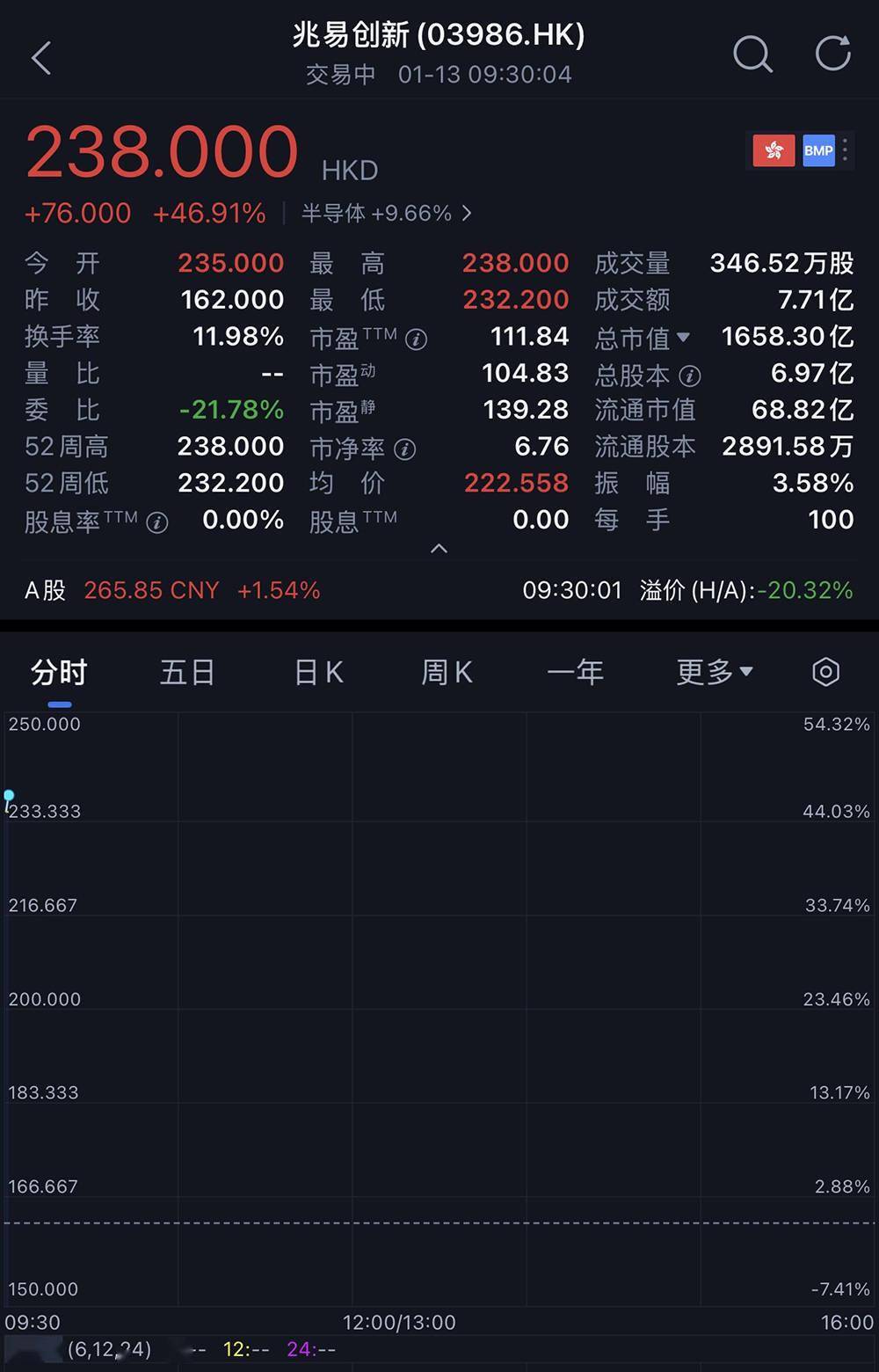 其发行价为每股162.00港元(约合人民币144.92元),开盘价为每股235.00港元(约合人民币210.22元),上涨45.06%,总市值为1637.40亿港元(约合人民币1465亿元)。