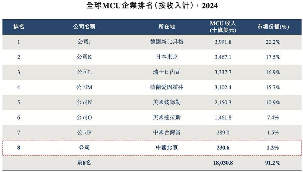 2024年,全球MCU市场的竞争格局呈现出相对稳定和高度集中的特点,前五家企业合计约占市场总规模的81.2%。其中,兆易创新2024年的收入约为2.31亿美元,市场份额约为1.2%,在全球企业中排名第八,在中国内地企业中排名第一。