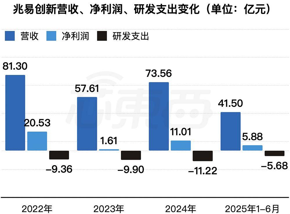 2022年,2023年、2024年、2025年1-6月,兆易创新的收入分别为81.30亿元、57.61亿元、73.56亿元、41.50亿元,净利润分别为20.53亿元、1.61亿元、11.01亿元、5.88亿元,研发开支分别为9.36亿元、9.90亿元、11.22亿元、5.68亿元。