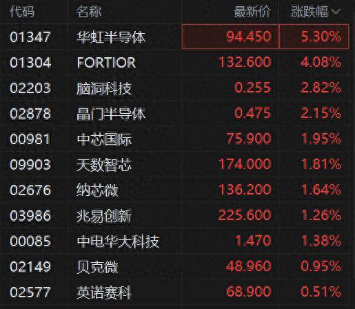 港股半导体股集体拉升上涨,其中,华虹半导体涨超5%,晶门半导体、中芯国际涨2%,纳芯微涨1.6%,兆易创新、中电华大科技、贝克微、英诺赛科皆有涨幅
