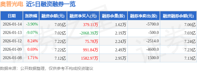 奥普光电融资融券信息显示,融资方面,当日融资买入1.25亿元,融资偿还1.21亿元,融资净买入379.11万元。融券方面,融券卖出200.0股,融券偿还5900.0股,融券余量1.62万股,融券余额96.11万元。融资融券余额7.06亿元。