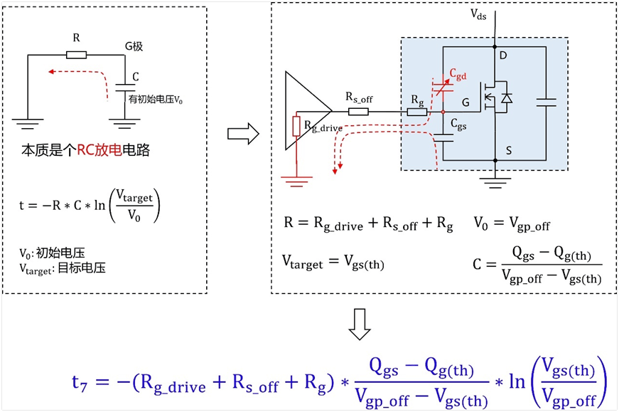 t7为GS电压从米勒平台电压Vgp_off到Vgs(th)的放电过程,使用RC放电电路模型,如下图所示