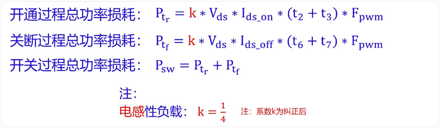 因此,上面的tr类比于电感负载的t2+t3,即tr=t2+t3;tf类比于电感负载关断时间t6+t7,即tf=t6+t7,最终可得总开关损耗:
