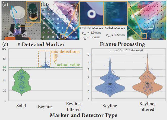其次是创新的"关键线标记"(Keyline Markers)。研究团队设计了由黑色内圈(半径0.6mm)和白色外圈(半径1.0mm)组成的同心圆标记,即使在复杂背景下,内圈的"关键线"也能保持清晰可见。