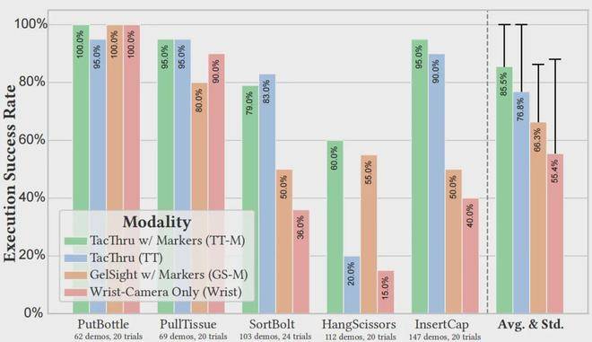 在"抽取纸巾"任务中,薄软的纸巾无法产生足够的接触力让传统触觉传感器检测到,纯视觉方案因分辨率不足成功率极低,而TacThru通过近距离视觉观察,能实时捕捉纸巾的位置和形变,即使出现打滑也能迅速触发重新抓取,成功率远超其他方案。