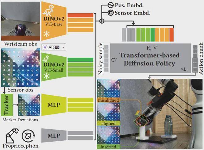 该框架的核心在于多模态信号的智能融合。系统同时接收四种输入:手腕摄像头的全局视觉信息、TacThru的近距离视觉图像、标记点位移产生的触觉数据,以及机器人的本体感受信息。通过DINOv2视觉编码器和专用MLP网络,这些异质信号被编码为统一的特征令牌,再由Transformer模型动态分配注意力权重,根据不同场景智能选择依赖视觉还是触觉信息。
