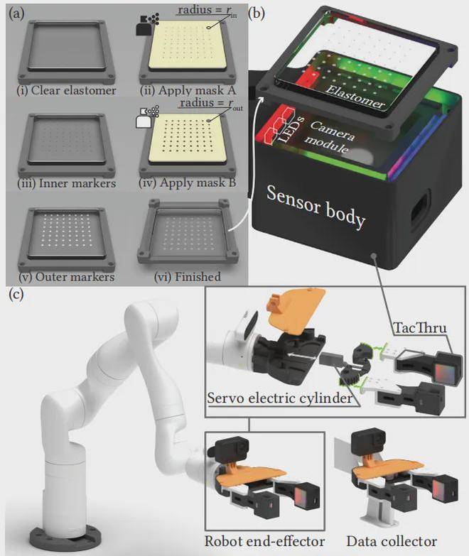 首先是材质方面,团队选择全透明弹性体材质。不同于传统传感器的半透明或不透明涂层,TacThru采用完全透明的弹性体,配合持续的LED照明,让内置摄像头既能"看穿"弹性体观察外部环境和物体,又能捕捉内部的触觉信号。这种设计摒弃了繁琐的模态切换机制,实现了真正意义上的同步感知。