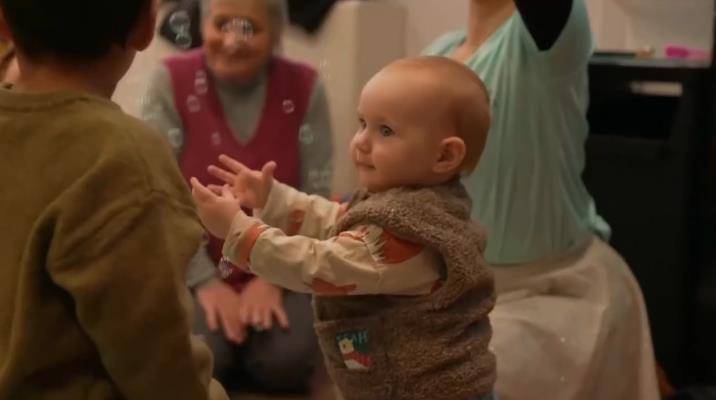 幼儿与家长们在做游戏 一名婴儿试图抓住泡泡
