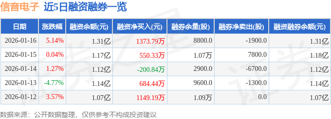 证券之星消息,截至2026年1月16日收盘,信音电子(301329)报收于26.78元,上涨5.14%,换手率24.28%,成交量14.55万手,成交额3.81亿元。