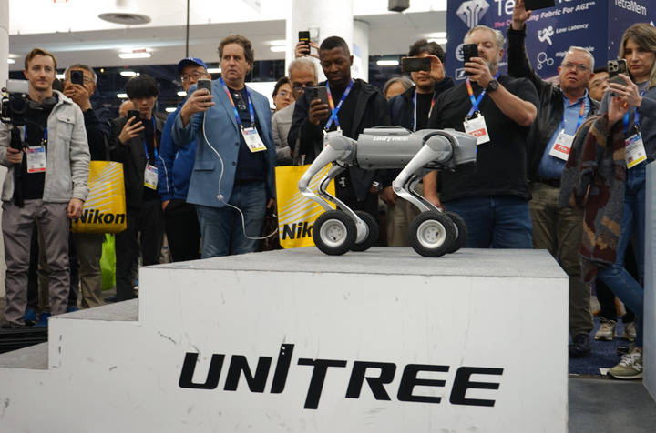 1月8日,在美国拉斯维加斯,人们在宇树科技展区观看机器狗展示。(新华社发)