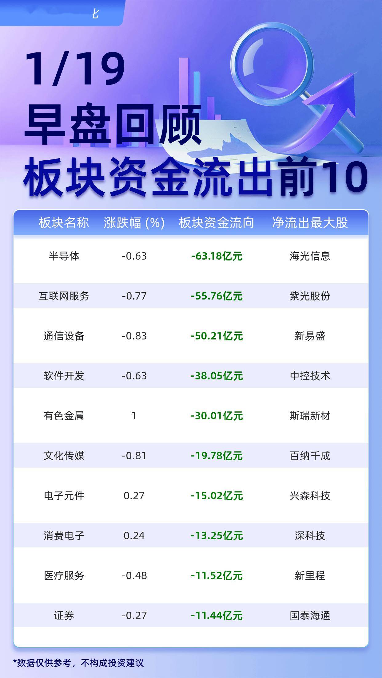 据交易所数据显示,截至1月19日午间收盘,大盘主力资金净流出260.92亿元。主力资金流出前十大板块分别为: 半导体(-63.18亿元)、互联网服务(-55.76亿元)、 通信设备(-50.21亿元)、 软件开发(-38.05亿元)、 有色金属(-30.01亿元)、文化 传媒(-19.78亿元)、电子元件(-15.02亿元)、 消费电子(-13.25亿元)、 医疗服务(-11.52亿元)、 证券(-11.44亿元)。