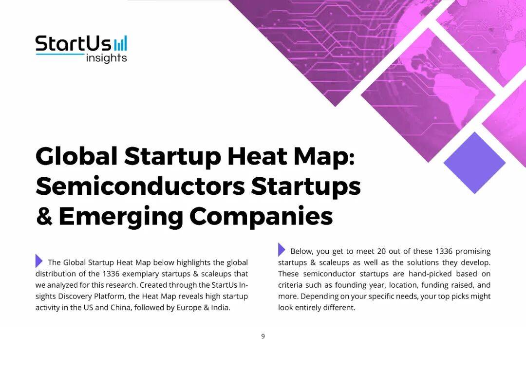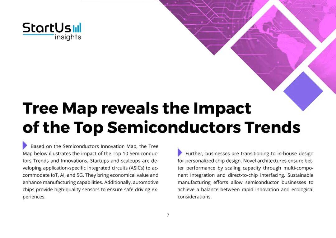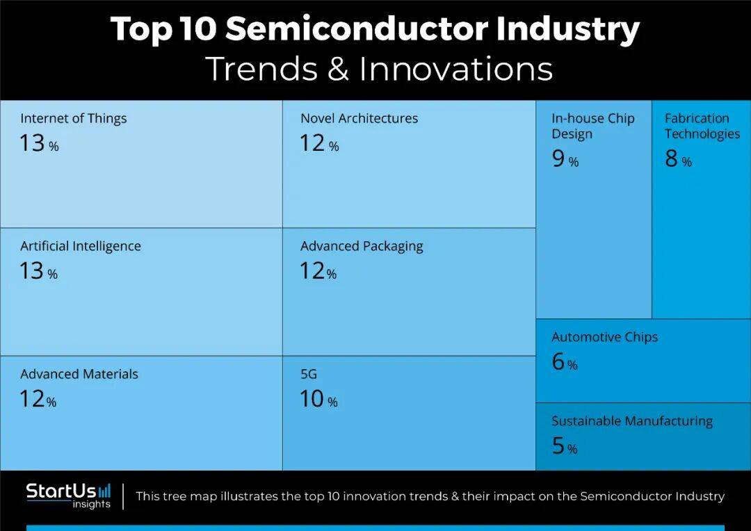 在这一宏观背景下,StartUs Insights 用大数据平台扫描了 470 万家初创与成长型企业,最终聚焦 1336 家半导体公司,提炼出十大趋势。它们不是孤立的技术点,而是一张互相咬合的“创新网络”:
