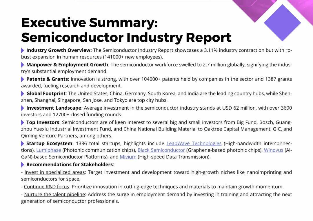 2026 年全球半导体行业正同时经历“收缩”与“扩张”的悖论:整体产值微降 3.11%,但全球员工总数却新增 14.1 万,总就业人口达到 270 万;资本层面,3600 多位投资者在 1.27 万轮融资里平均砸下 6200 万美元,说明资金仍在疯狂寻找下一个爆发点。美国、中国、德国、韩国、印度是国家级枢纽,深圳、上海、新加坡、圣何塞、东京则是城市级热点。专利和补贴继续加码——全行业手握 10.4 万件专利、拿到 1387 笔政府资助,创新底气依旧充足。
