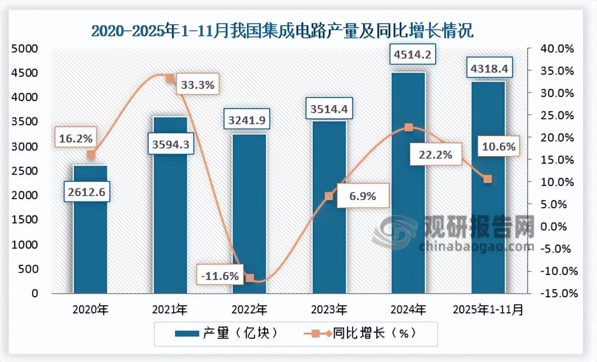 随着国内半导体企业持续增加研发投入,其技术创新实力明显增强,而这也推动着国内集成电路的生产效率与品质稳步提升。数据显示,2025年1-11月,中国集成电路产量为4318.4亿块,同比增长10.6%。