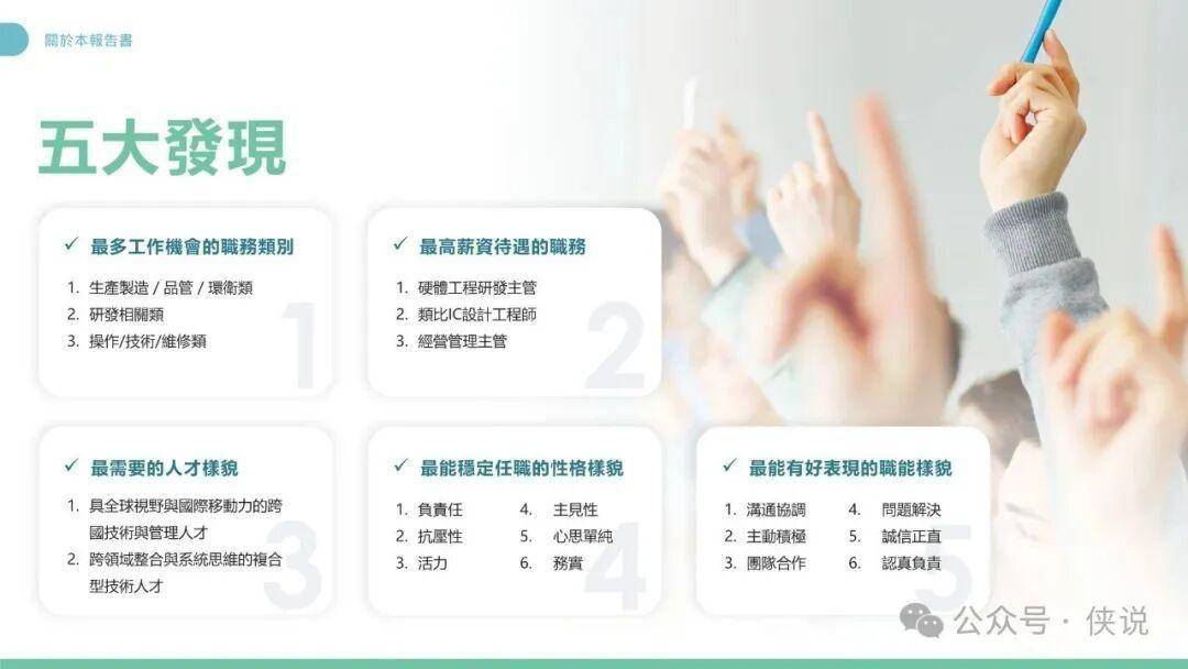 最佳人才样貌清晰勾勒:性格上需具备负责任、抗压性、活力等特质;职能上沟通协调、主动积极、团队合作为核心;学历背景方面,研发类对科系要求最严,而操作/技术/维修类科系不拘比例高达58%,更看重实操与训练潜力。