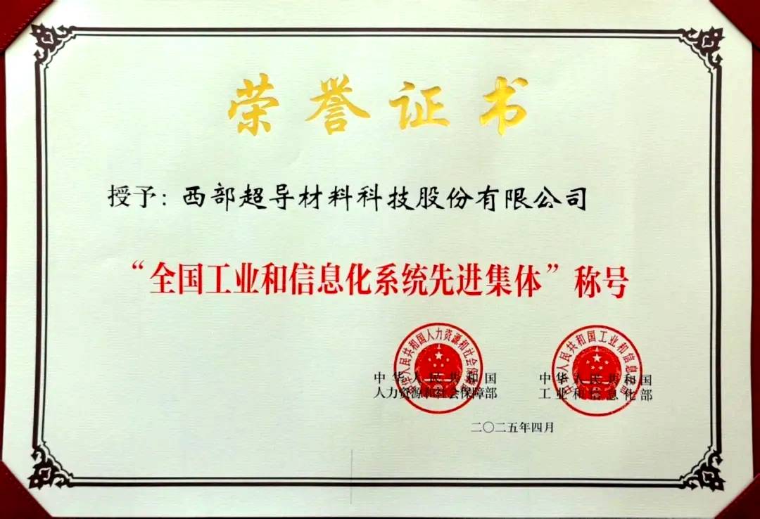 4月27日,全国工业和信息化系统先进集体、劳动模范和先进工作者表彰大会在京召开。西部超导材料科技股份有限公司被人力资源社会保障部、工业和信息化部联合授予“全国工业和信息化系统先进集体”荣誉称号。