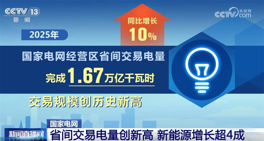 央视网消息:记者从国家电网了解到,2025年国家电网经营区省间交易电量完成1.67万亿千瓦时,同比增长10%,交易规模创历史新高。其中,省间新能源交易电量完成3177亿千瓦时、同比增长41%。