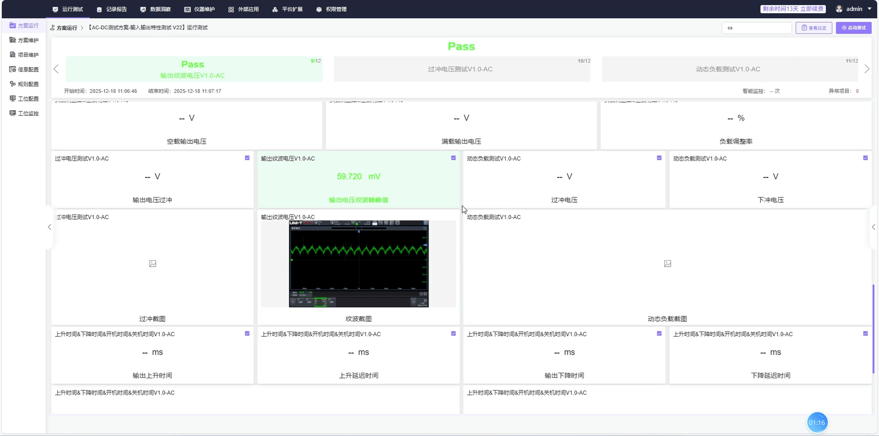 输出纹波与噪声测试:用示波器检测输出直流电压中的交流成分,包括纹波和噪声,通常要求几十 mV 以内。