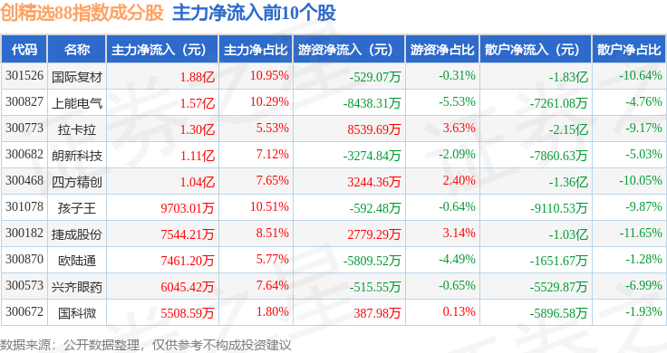资金流向方面,创精选88(399291)指数成份股当日主力资金净流出合计21.41亿元,游资资金净流入合计15.1亿元,散户资金净流入合计6.32亿元。成份股资金流向详情见下表: