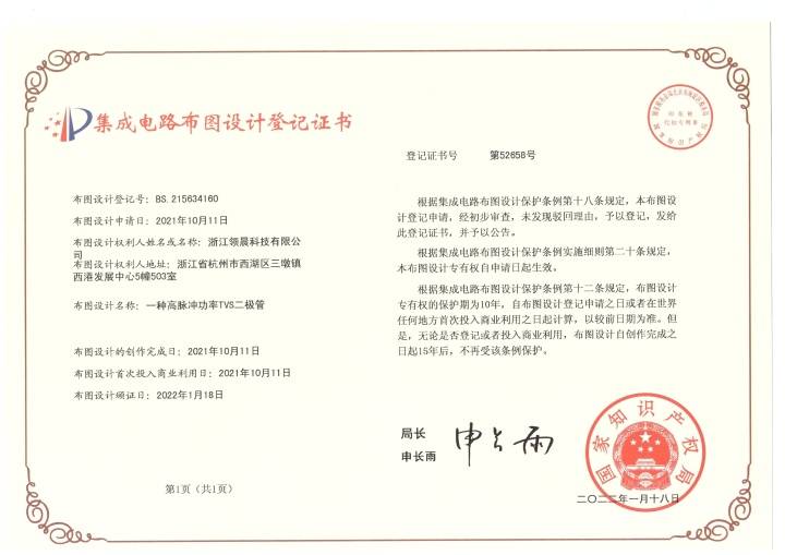 浙江领晨科技有限公司是一家专注于半导体元器件研发、生产与销售的国家高新技术企业。公司自成立以来,始终立足于自主创新,深耕于电路保护器件与半导体功率器件领域,现已成为国内高功率密度二极管行业的知名品牌与高端供应商。公司秉持“品质为先,开拓创新”的理念,以工匠精神打造每一颗产品,致力于为客户提供“微小轻量化、高能量密度、强散热性能、高可靠性”的半导体解决方案,推动半导体国产化进程。
