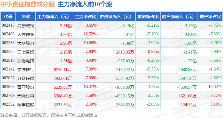 资金流向方面,中小责任(399651)指数成份股当日主力资金净流出合计8610.13万元,游资资金净流出合计9.1亿元,散户资金净流入合计9.96亿元。成份股资金流向详情见下表: