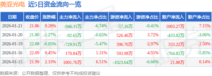 证券之星消息,截至2026年1月21日收盘,美亚光电(002690)报收于21.86元,上涨0.28%,换手率1.48%,成交量6.43万手,成交额1.4亿元。