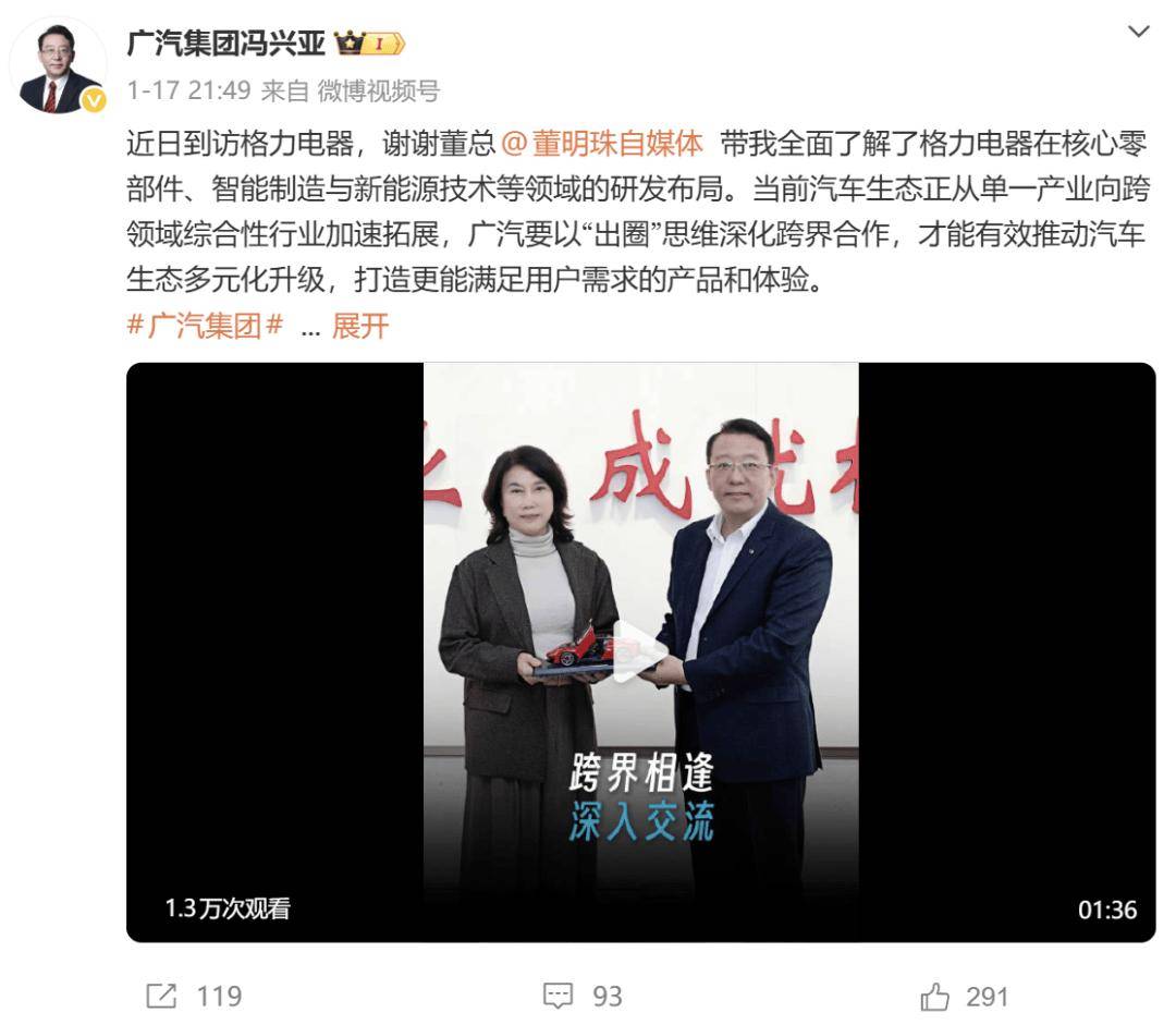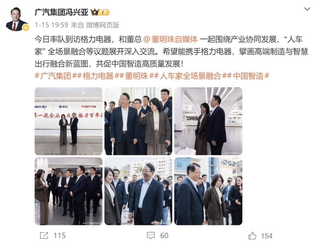 事情是这样的,1月15日,广汽集团董事长冯兴亚率队访问格力电器,与格力董事长董明珠及管理团队共商“人车家”智慧生态融合发展,探讨产业协同。冯兴亚在邀请董明珠体验昊铂A800时表示,广汽集团为其高端品牌昊铂专门做了一款攀登版,该车搭载1004颗芯片,且知识产权均属于中国。董明珠听闻笑称:“将来有500个是我的”,随后,冯兴亚表示:“下一步争取把你的车芯片都装到这车上来”。而这被部分内容也被媒体解读为明确合作承诺并广泛传播。此后,冯兴亚还在微博发布:“近日到访格力电器,谢谢董总@董明珠自媒体带我全面了解了格力电器在核心零部件、智能制造与新能源技术等领域的研发布局。当前汽车生态正从单一产业向跨领域综合性行业加速拓展,广汽要以‘出圈’思维深化跨界合作,才能有效推动汽车生态多元化升级,打造更能满足用户需求的产品和体验。”