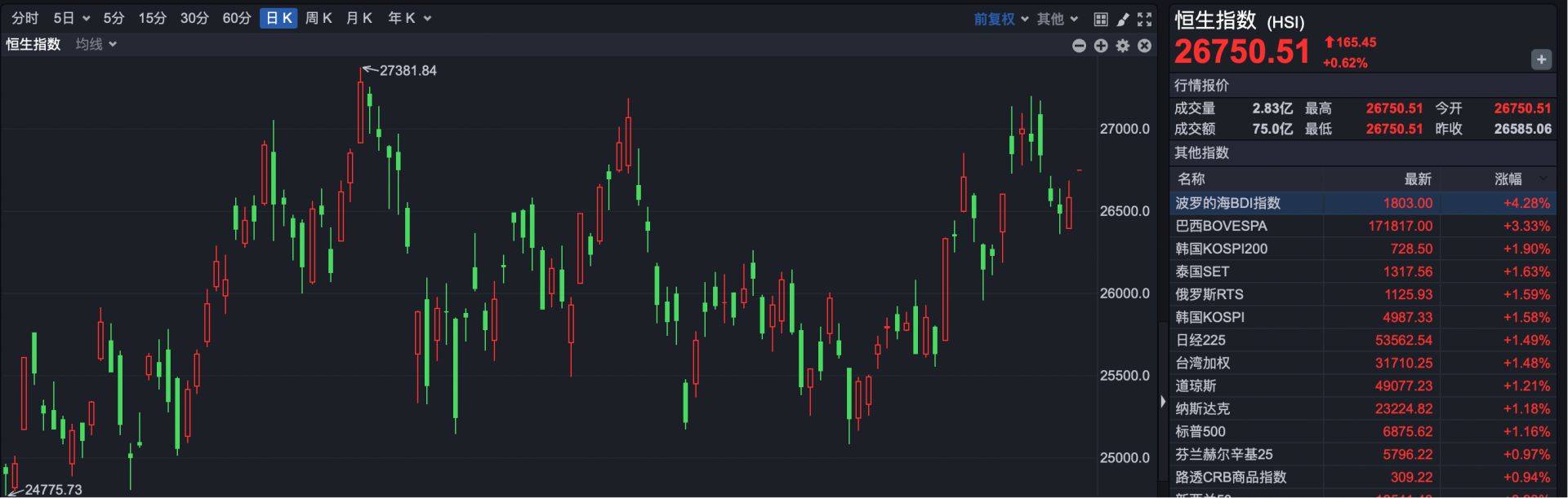 截至发稿,恒生指数报26750.51点,上涨165.45点,涨幅0.62%。