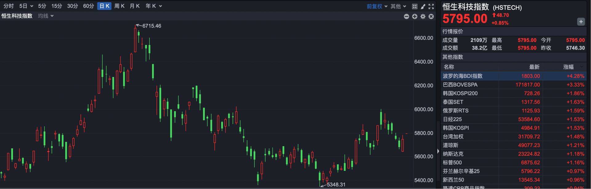 恒生科技指数报5795点,上涨48.70点,涨幅0.85%。