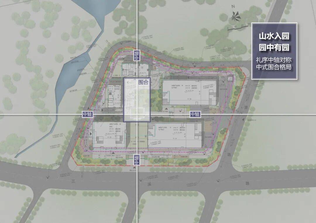 整体规划传承古代礼序轴线的思想精髓,与儒家、道家文化相符相生。东西与南北两条主轴将场地切分为四个象限,各个功能区域、各个楼栋嵌入各自的象限,互不干扰,形成“山水入园,园中有园”的中轴对称、中式围合格局。