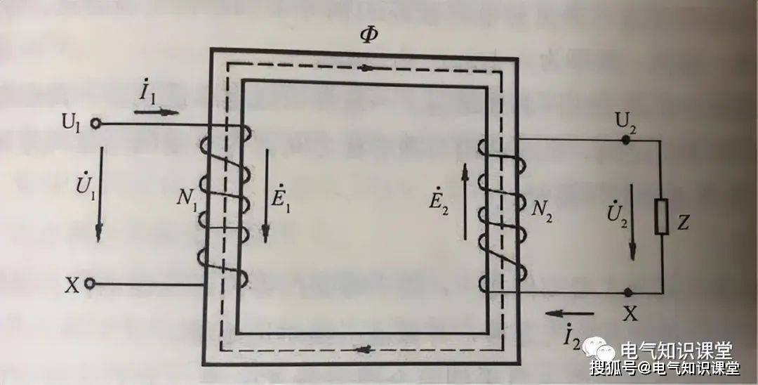 当一次绕组加有电压时,绕组就会有交流电流通过,铁芯中就会产生与电源频率相同的交变磁通Φ1,由于一次绕组和二次绕组在一个铁芯上,根据电磁感应定律,在二次绕组会产生频率相同但数值不同的感应电动势E2。