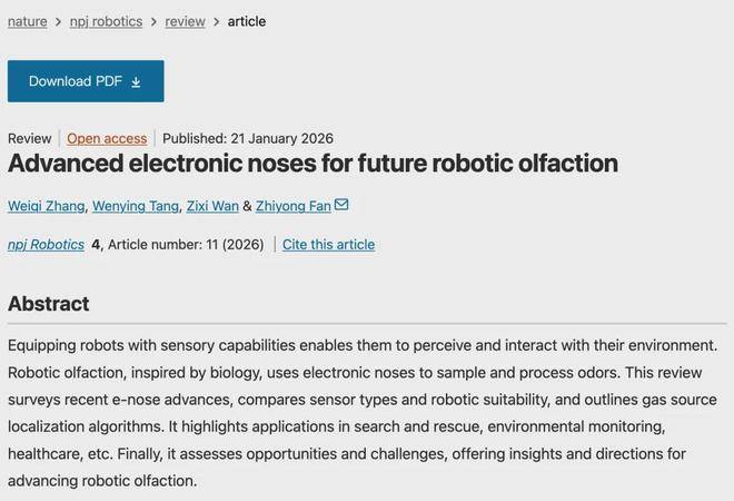 近日,香港科技大学研究团队在Nature旗下期刊《npj Robotics》发表重磅综述,系统梳理了电子鼻在机器人嗅觉领域的最新进展,揭示出这项技术如何赋予机器人嗅觉,使其在搜救、医疗、环境监测乃至家庭服务中发挥不可替代的作用。