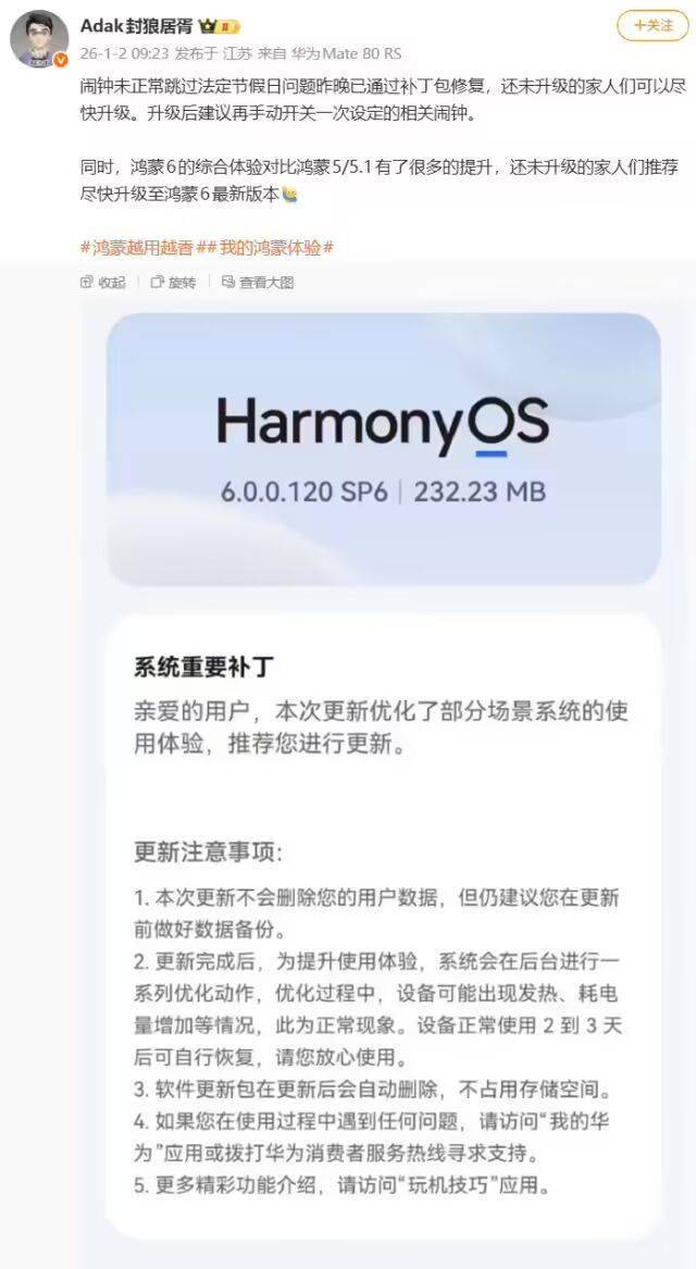华为鸿蒙系统 6.0.0.120 SP6 更新现已推送, 主要优化了系统使用体验。