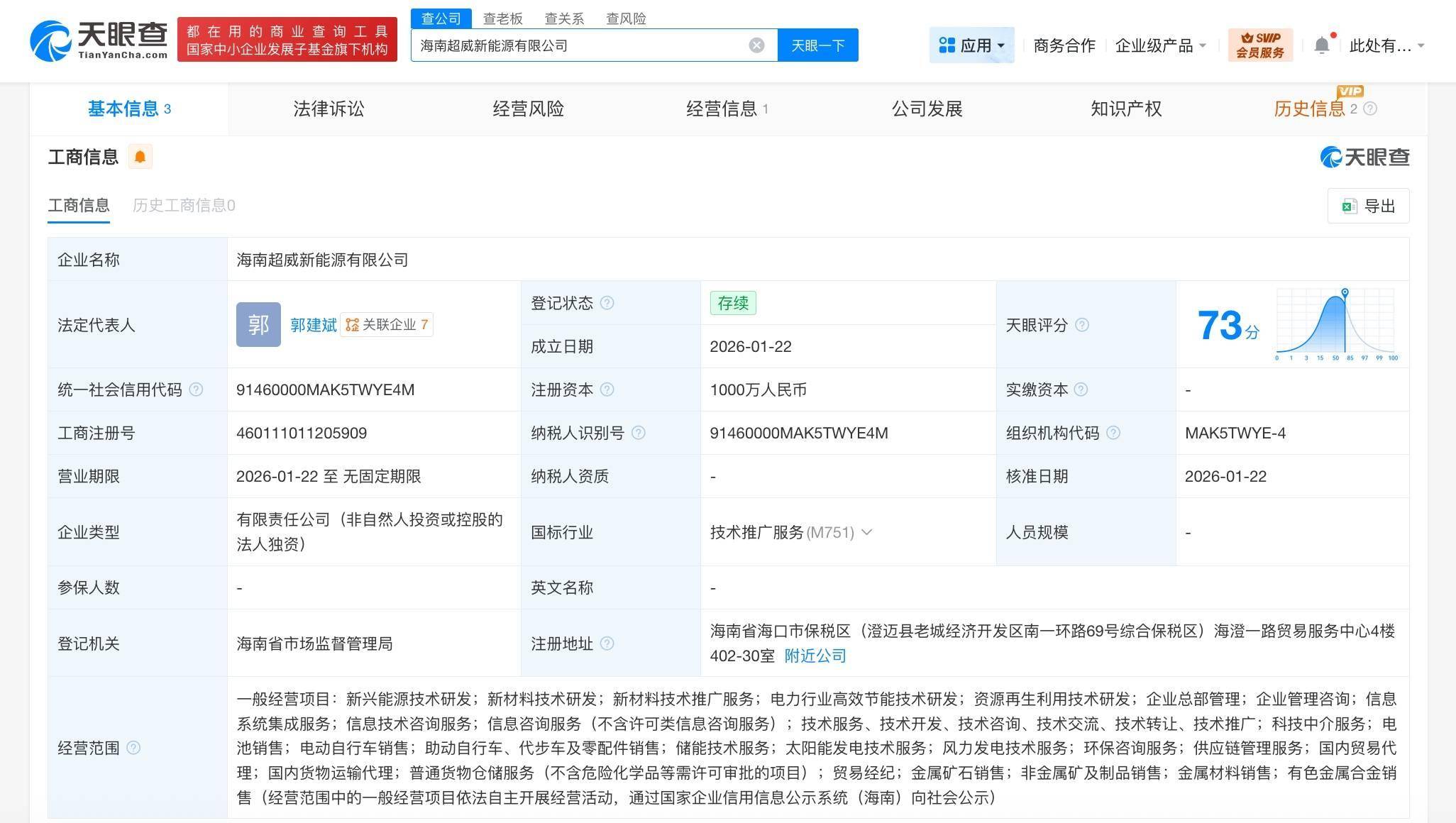 天眼查工商信息显示,近日,海南超威新能源有限公司成立,法定代表人为郭建斌,注册资本1000万人民币,经营范围含新兴能源技术研发、新材料技术研发、新材料技术推广服务、电力行业高效节能技术研发、资源再生利用技术研发、企业总部管理、企业管理咨询、信息系统集成服务等。股东信息显示,该公司由超威电源集团有限公司全资持股。