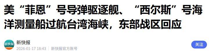 据报道,1月18日消息,美国海军“菲恩”号导弹驱逐舰与“西尔斯”号海洋测量船,近日完成了对台湾海峡的过航行动。