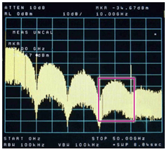 对于30 GHz以下的频谱,两者显示出几乎相同的特性,但PPG-2频谱在35 GHz左右显示出略高的水平。这表明PPG-2的波形具有更陡的上升沿和下降沿,更接近理想的矩形波形。因此,图11表明,频谱包含大量的7次谐波分量。
