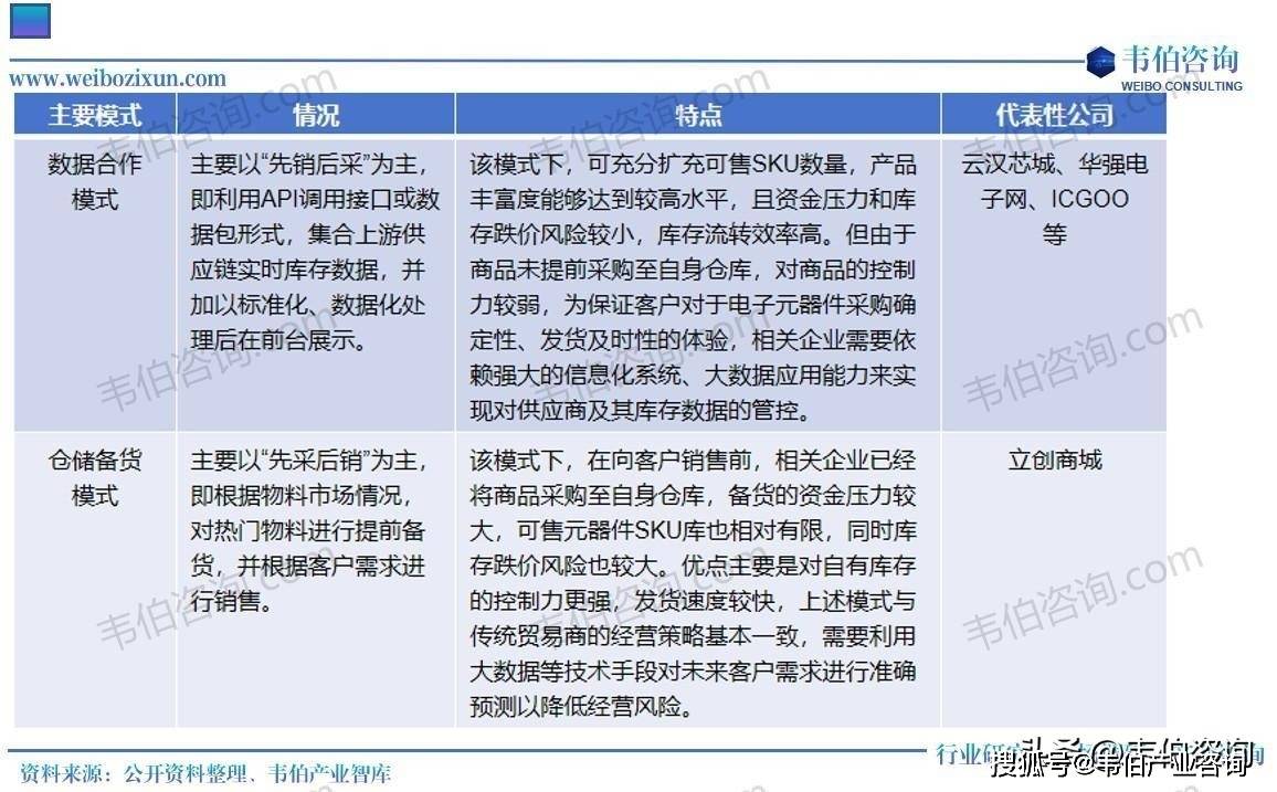 整体而言,电子元器件分销和产业互联网融合领域在未来仍具有较好的发展机遇和市场前景。从经营模式上看,国内企业在开展业务方面有2种主要模式,分别为数据合作模式和仓储备货模式,两种模式情况和特点如下: