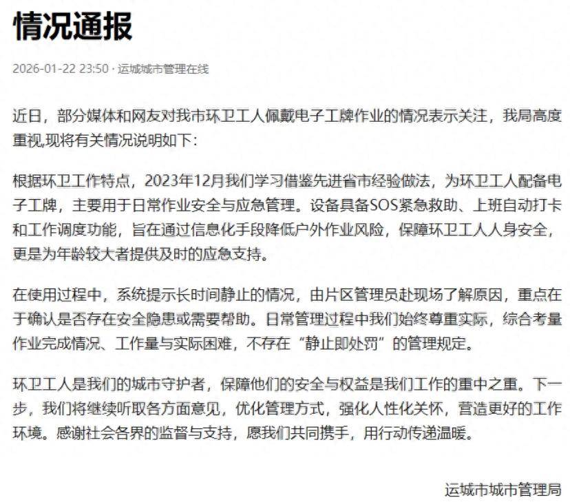 近日,部分媒体和网友对我市环卫工人佩戴电子工牌作业的情况表示关注,我局高度重视,现将有关情况说明如下: