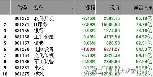 从行业板块资金净流出来看,软件开发、IT服务、银行净流出排名前三,工业金属、证券、电网设备等紧随其后。
