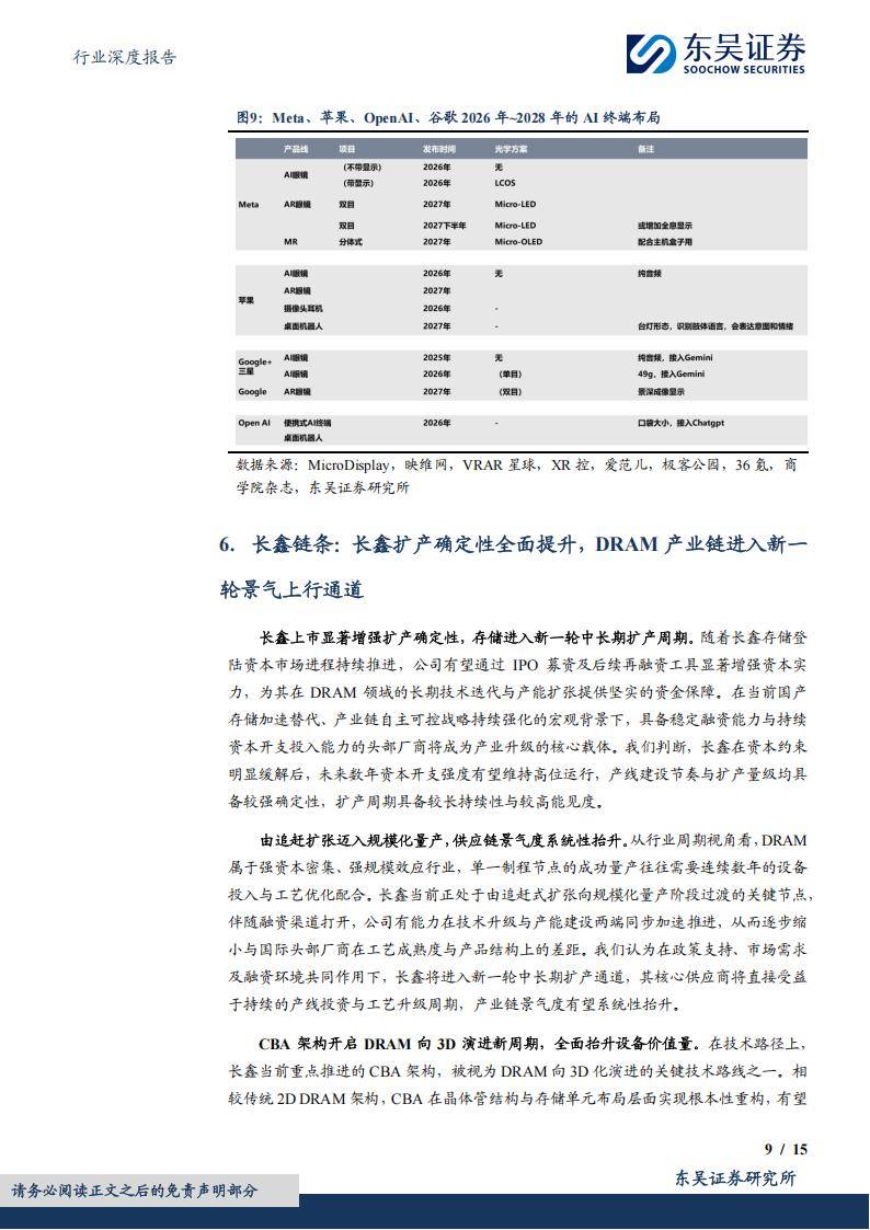 2026年至2028年,海外头部厂商将集中推出AI终端新品。Meta、苹果、谷歌和OpenAI均在眼镜形态产品上重金布局,眼镜被认为是距离五官最近、最理想的可穿戴硬件。Meta预计在2026年推出不带显示和带LCOS显示的AI眼镜,2027年则计划推出双目Micro-LED AR眼镜。