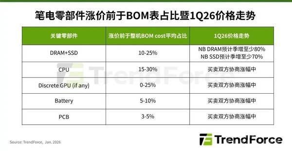 【CNMO科技消息】1月26日,根据TrendForce集邦咨询最新调查,全球笔记本电脑品牌自2025年下半年起面临存储器价格显著上涨的压力,2026年初又遭遇CPU阶段性供给缺口、价格调涨的压力,加上包括PCB、电池、电源管理IC等零部件成本同步上行,预估将导致2026年第一季全球笔记本电脑出货季减14.8%。