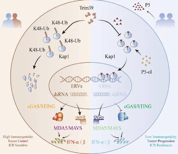 机制分析显示,长期缺乏性行为会激活下丘脑-垂体-肾上腺轴,促使肾上腺合成并释放大量孕烯醇酮(P5,多种类固醇激素合成的前体),其会直接结合并稳定肿瘤细胞内的转录抑制因子Kap1蛋白,从而抑制了内源性逆转录病毒的表达,进而抑制I型干扰素信号通路激活。