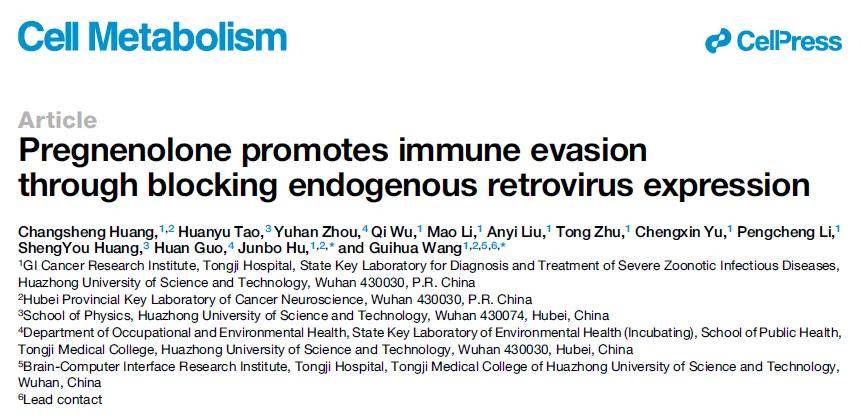 2026年1月23日,华中科技大学王桂华、胡俊波团队在" Cell Metabolism "期刊上发表了一篇题为" Pregnenolone promotes immune evasion through blocking endogenous retrovirus expression "的研究论文。